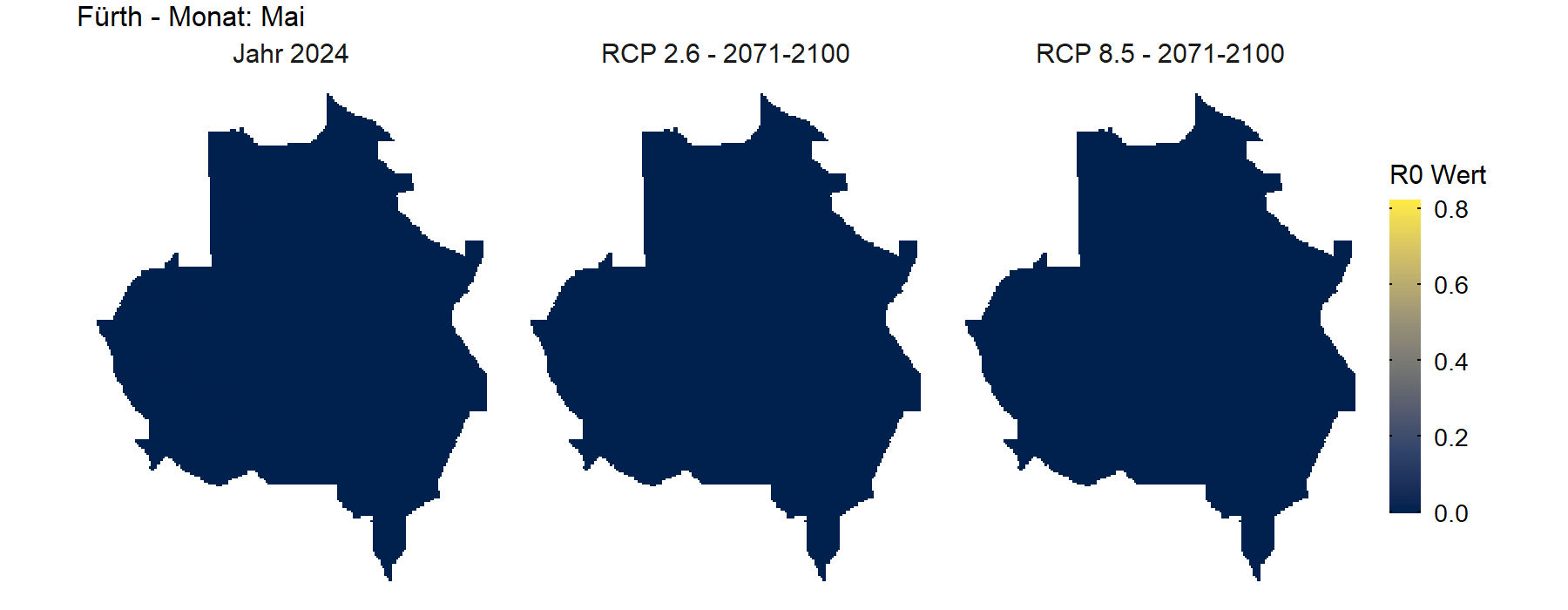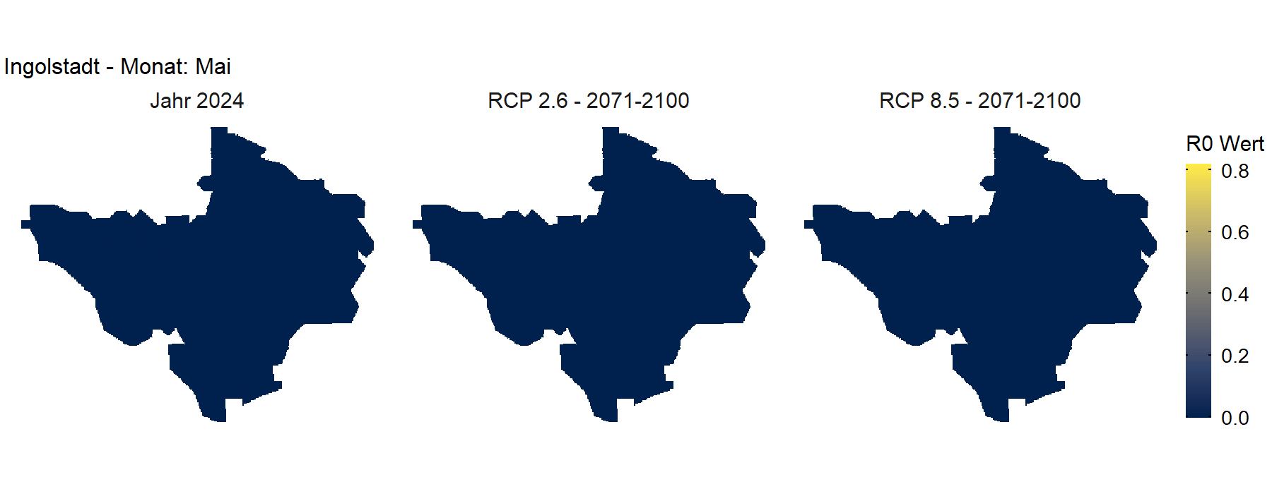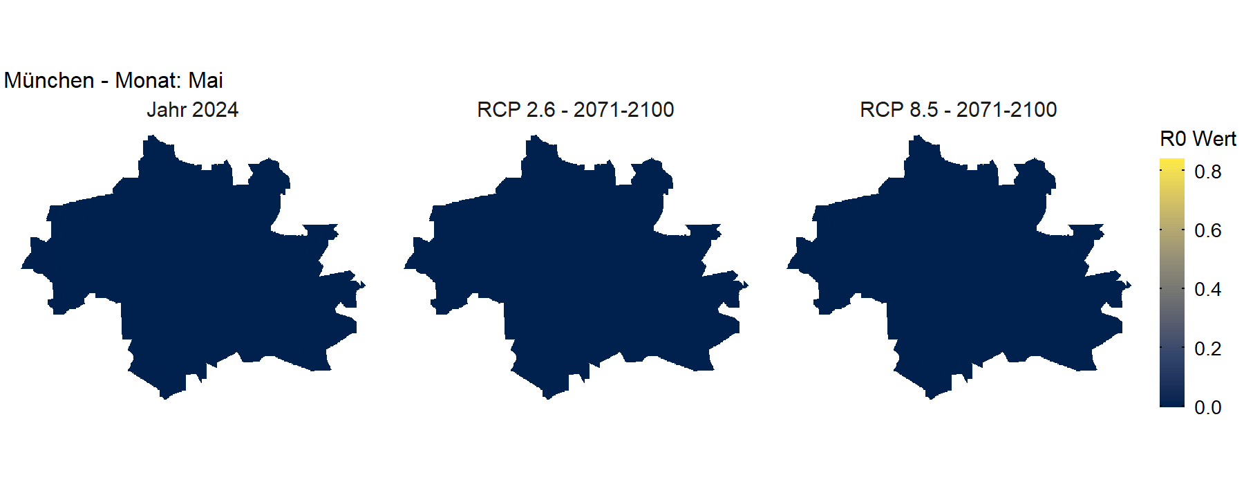 The following maps show the average R0 values for May to October in the respective cities. The animations consist of three individual maps. The first map shows the risk of infection with the chikungunya virus in 2024, the second map shows the projected risk of infection for 2071-2100 under the RCP 2.6 climate scenario, and the third map also shows the risk of infection for 2071-2100, but with climate developments assuming the RCP 8.5 scenario.