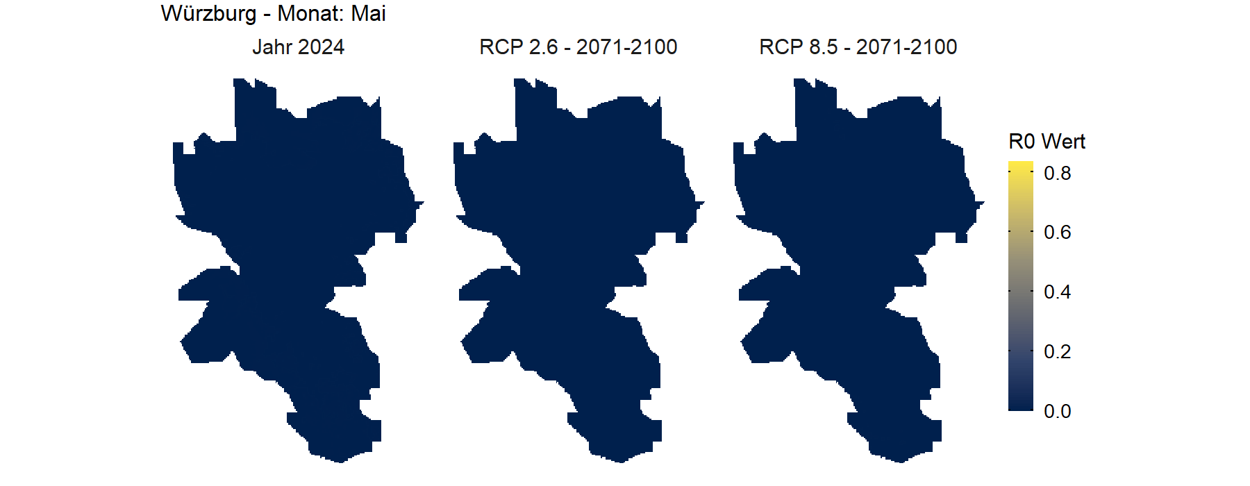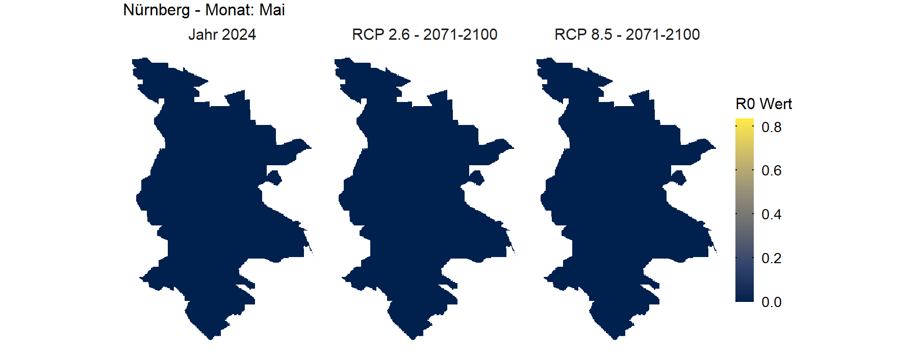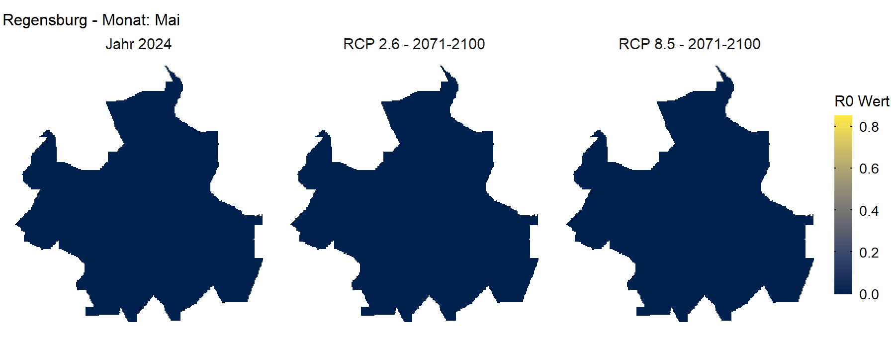 The following maps show the average R0 values for May to October in the respective cities. The animations consist of three individual maps. The first map shows the risk of infection with the chikungunya virus in 2024, the second map shows the projected risk of infection for 2071-2100 under the RCP 2.6 climate scenario, and the third map also shows the risk of infection for 2071-2100, but with climate developments assuming the RCP 8.5 scenario.