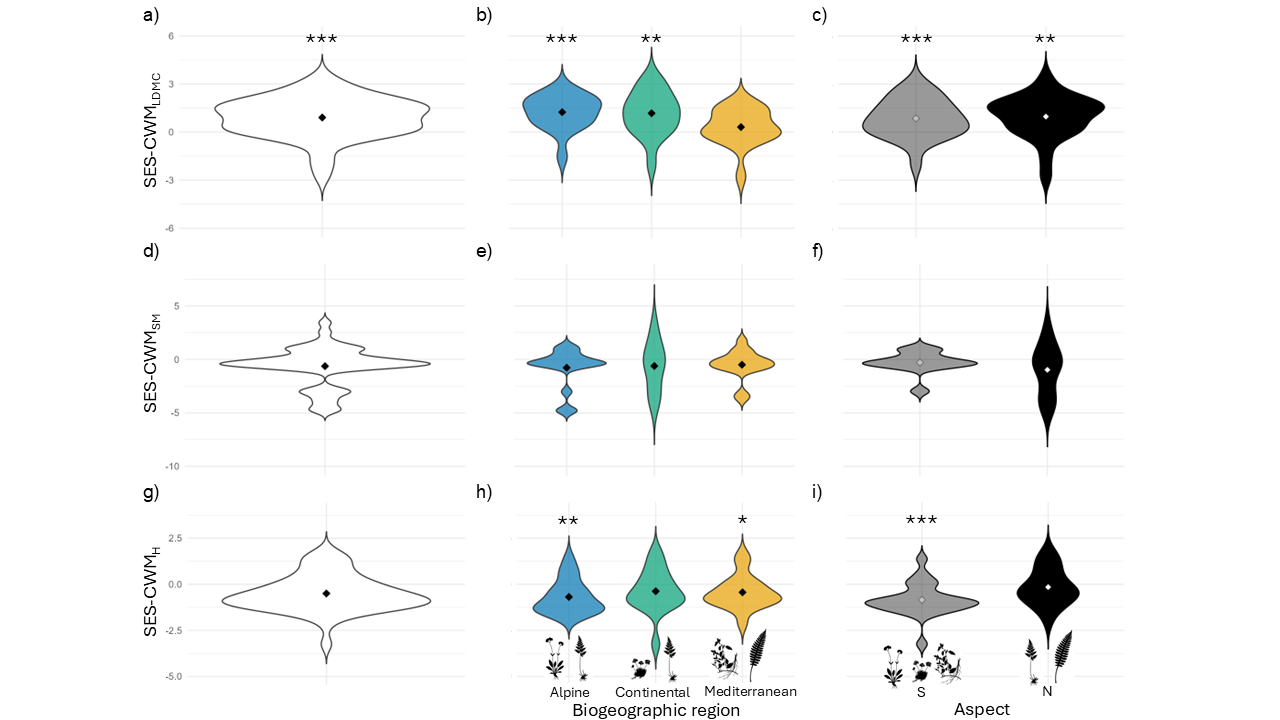 Distribution of standardized effect sizes for community weighted means of three traits proxy of stress tolerance: leaf dry matter content (SES-CWMLDMC, top row), seed mass (SES-CWMSM, middle row) and plant height (SES-CWMH, bottom row). Panels are arranged in a 3 × 3 grid: columns denote the type of comparison and rows correspond to traits. Column 1 (a, d, g) shows the overall distribution of SES-CWM across all plots (n = 48); Column 2 (b, e, h) shows within‑biogeographic‑region variation (alpine, continental, mediterranean); Column 3 (c, f, i) shows the effect of aspect (North vs South). Diamonds indicate sample means. For each panel, the significance of mean values different from zero was assessed with linear models using HC3 robust standard errors. The model intercept (for overall distributions) and the estimated marginal means (for biogeographic regions and aspects) were tested against zero. Significance is shown only when the intercept or the one‑tailed test indicates stress‑tolerance: i.e. SES-CWMLDMC and SES-CWMSM significantly greater than zero (right‑tailed tests), and SES-CWMH significantly less than zero (left‑tailed tests). Significance levels: *** p < 0.001, ** p < 0.01, * p < 0.05.